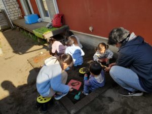 集いで「今日はどうする?」と子ども達に相談すると沢山の意見が出てきましたがポカポカして暖かいのでお庭で過ごす事になりました!