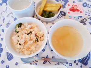 【後期】☆麻婆豆腐丼(軟飯)☆玉葱のスープ☆蒸かしさつま芋☆小松菜のおかか和え☆ベビーダノン