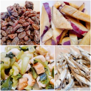 ☆さつま芋の中華炒め☆小松菜と竹輪の酢の物☆小魚☆レーズン