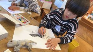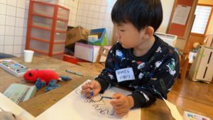 安藤先生が持ってきてくれた物(キティちゃん、カエル、トカゲ)から自分で模写したい物を選び、クレヨンで表現をするという内容でした♪