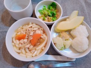 ☆野菜煮込みうどん☆ころころおにぎり☆青のりじゃがいも☆レタスのりサラダ☆りんご