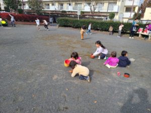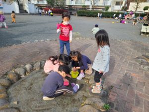 クローバー公園に着くと山茶花の花を見つけました!!この公園は秋には金木犀がいい匂いで出迎えてくれましたが段々と冬の花に移り変わり、自然の中の発見から〝冬〟感じていた子ども達です。