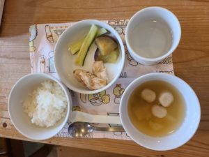 【完了期】☆軟飯☆カンパチの塩焼き☆金目鯛の煮付け☆生わかめのサラダ(刻み)☆白菜とお麩の味噌汁☆さつま芋甘煮☆柿