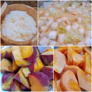 ☆玄米入りご飯/白米☆白菜とお麩の味噌汁☆さつま芋の甘煮☆柿