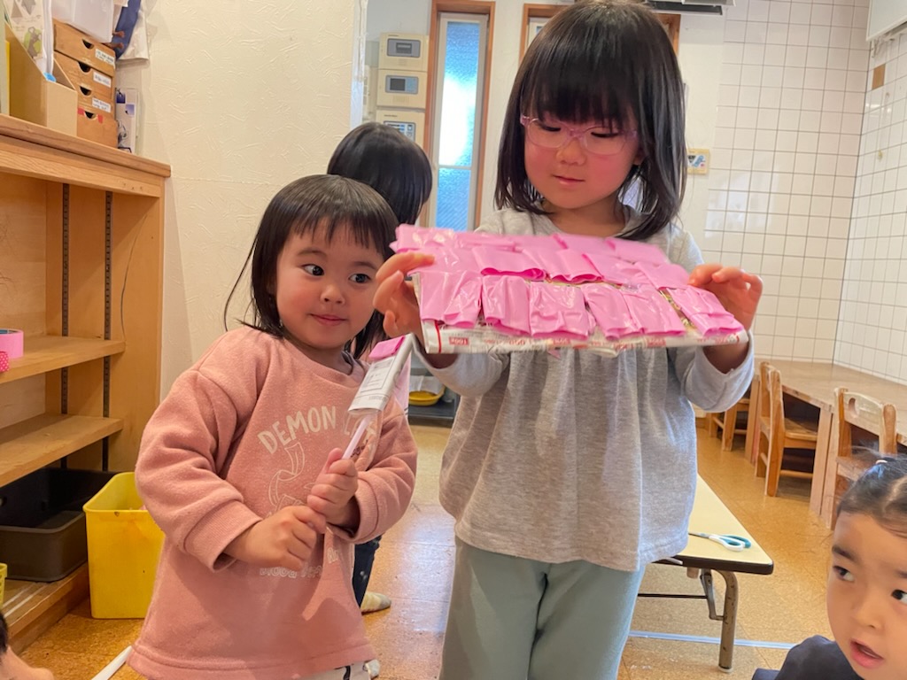 今日も冷たい雨が降りあいにくの天気でしたね・・・☔アトリエでは女の子達がお掃除道具を作っていました♪ぺたぺた貼ったピンクのテープで床のごみを取りながらお掃除をしてくれるそうです♪子ども達の発想はおもしろいですね😊