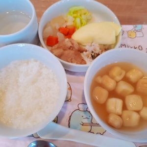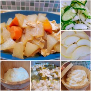 ☆玄米入りご飯/白米☆お麩とわかめの味噌汁☆大根と人参煮☆白菜の浅漬け☆りんご