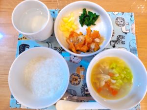 【後期】☆5倍粥☆具沢山汁☆南瓜のそぼろあんかけ☆小松菜のり和え☆柚りんご