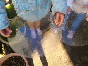 大きな氷を発見しました♪「冷た~い!!」「大きくて綺麗だね♪」と氷に触れ様々な事を感じていた子ども達です😊