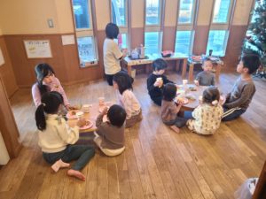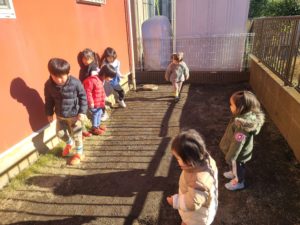 日向の方では霜柱が溶け始め湿った土を見つけ「なんで濡れてるの~?雨降ったっけ?」不思議そうな子ども達・・・