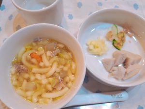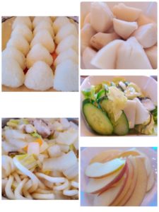 ☆塩おにぎり☆鶏と野菜煮込みうどん☆里芋の煮っ転がし☆蕪と胡瓜の塩昆布和え☆りんご