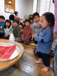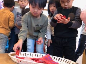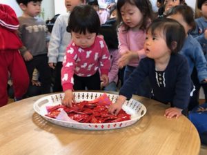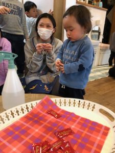 一週間の始まりは朝から雨が降り続き、子ども達はそれぞれやりたい事を選んで室内遊びを楽しんでいました。そこへ「会議するからみんな集合!」と園長のひと声が。何事かと真剣な顔で集まり話を聞く子ども達。「今日は2月何日?」『15日。』「昨日は?」『2月14日!』「昨日は何の日だった?」『う~ん…あっ、バレンタインデー!』ということで、スタッフから大好きな子ども達へチョコのプレゼントを贈りました♡『やった~♪』と笑顔があふれて喜ぶ子ども達でした(^^♪ 「1人2つづつ食べれます」『2つ?2つづついいの?』と話をよく聞いて確認していました。