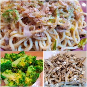 ☆焼うどん☆茹でブロッコリー☆小魚