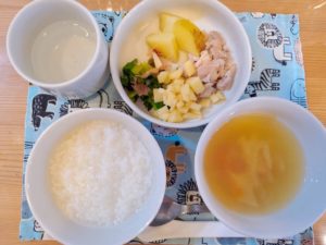 ☆5倍粥☆蕪と人参の味噌汁☆鶏肉の旨煮☆じゃが芋チーズ☆小松菜おかか和え☆りんご