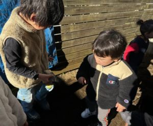 お庭にある水蓮鉢には氷が張っていてちょっと触ったりしてみると「冷たーい!」と自然に触れながら遊びました✨