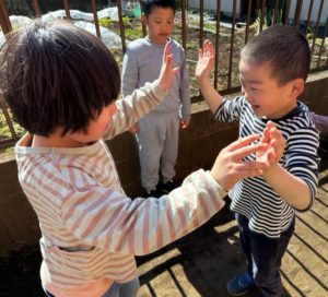 手押し相撲でしばらく遊んでいた子どもたちですが、次のしたい事として男の子たちが「筋トレ!!」と言い、