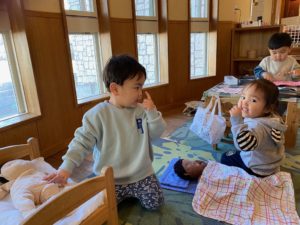 お部屋では「お人形がねたよ~、し~!」と友だちと楽しんでいました♪