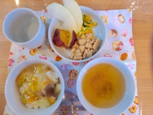 ☆中華丼☆きのこのスープ☆胡瓜とコーンのサラダ☆高野豆腐煮☆蒸かしさつま芋☆青りんご