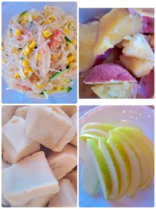 ☆春雨中華サラダ☆蒸かしさつま芋☆高野豆腐煮☆青りんご