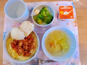 【完了期】☆ミートソーススパゲティー(鶏ひき肉/豚挽き肉)☆春野菜スープ☆白パン☆ブロッコリー☆チーズ☆ベビーダノン