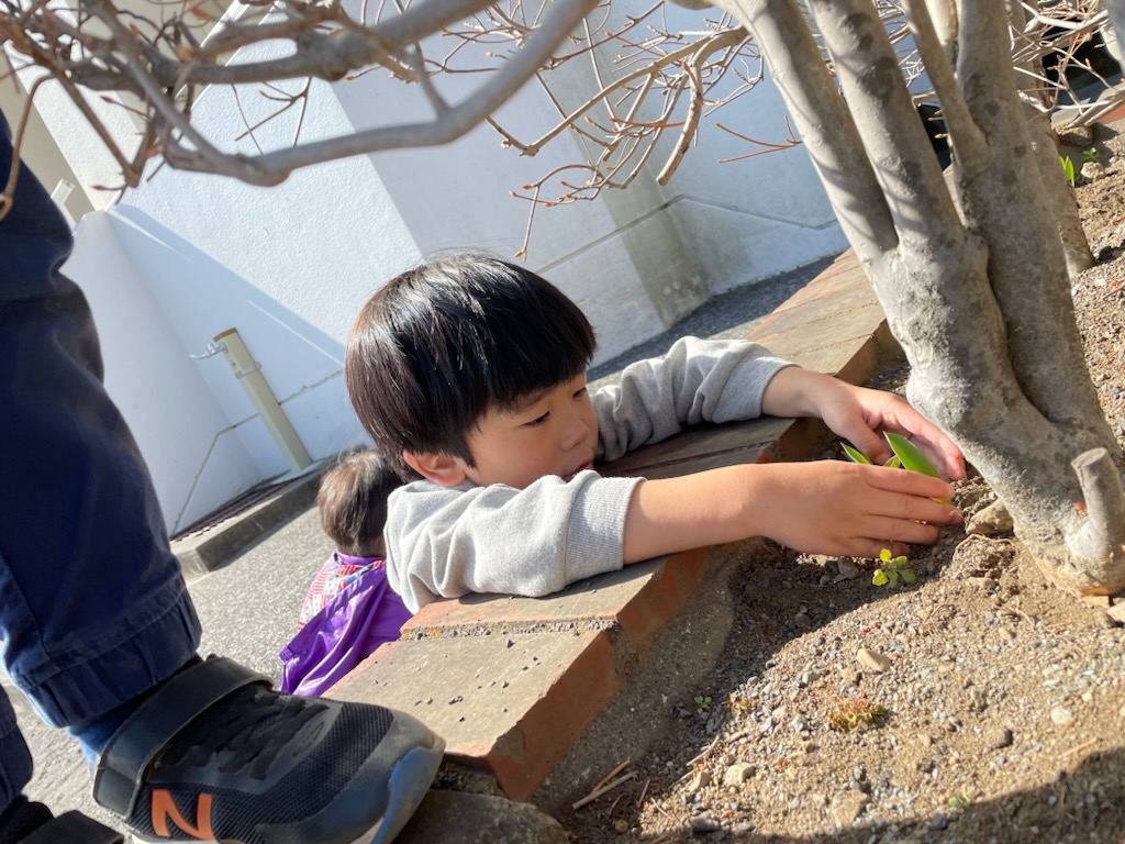 色々な場所で小さな芽が顔を出している様子が見られます🌱クローバー公園でもそんな様子がみられ気が付いた年中さんの男の子が周りに優しく土をかき集めて何か話しかけている様子でした😌子ども達の優しさが感じられました。