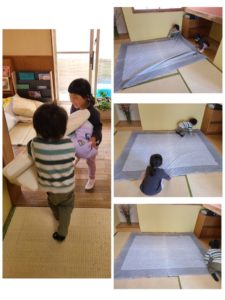 2人だけでマットを広げシワも伸ばしてきれいに敷いてくれました👍その後は力を合わせて楽しそうに布団を運んでいました☆いつの間にかこんなにお姉ちゃんお兄ちゃんになったんだなぁと嬉しく思いました😌