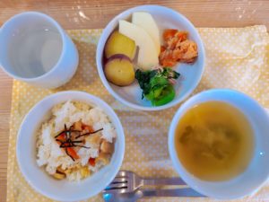 【完了期】☆筍ご飯☆えのきとわかめの味噌汁☆鮭の塩焼き☆小松菜とツナの和え物☆蒸かしさつま芋☆りんご