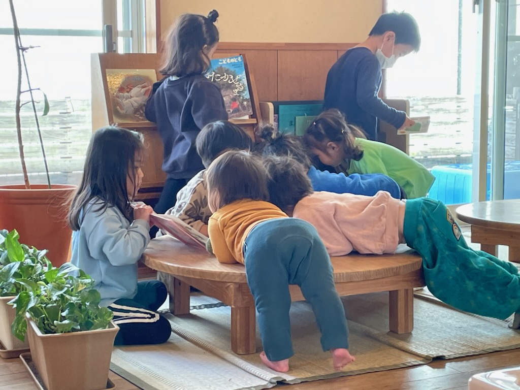 絵本コーナーでの一コマです。年長のお姉ちゃんが絵本を読んでくれました☺小さい子達が嬉しそうに集まって来ていました♪一緒に生活をする中でこういう時間がお互いにとって心地良いのでしょうね🍀