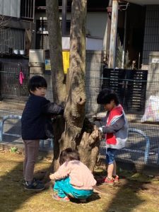 公園に行く前にグラウンドの外周を春探ししながらまわりました。「セミの抜け殻あるかな~?」と男の子達は夏にたくさんの抜け殻がくっついていた木を探し始めました。(春探しのはずでしたが…(^_^;) さすがにないだろう…と思っていましたが「あった!」と3歳児の男の子が抜け殻を発見!(写真がなくてごめんなさい🙇) 春を飛び越えた発見でした✨