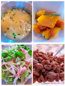 ☆豆腐とニラの味噌汁☆南瓜の煮物☆新玉葱とハムの中華サラダ☆レーズン
