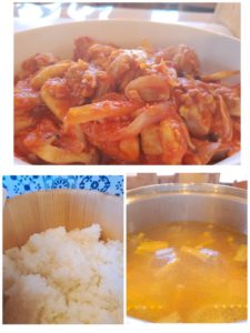 ☆鶏肉のトマト煮☆玄米入りご飯/白米☆新玉葱とえのきのスープ