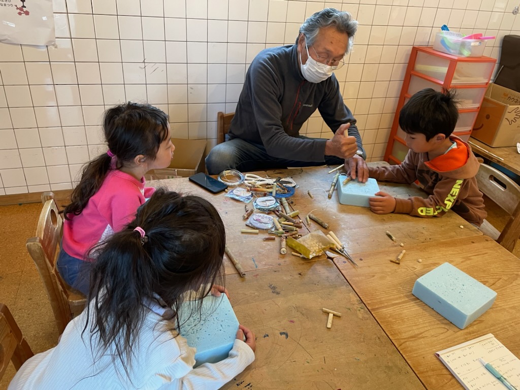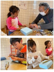 目打ちを使って自分で木に穴を開ける時は、それぞれが緊張した表情で集中して取り組んでいました。その小さな穴に針金を通すことに苦戦する時もありましたが、今までの経験から針金の先をピンっと伸ばして再チャレンジする姿がみられ、積み重ねの大切さを改めて感じました!そして「何度も何度もチャレンジするんだぞ」「一つの事を我慢強くやることは大事なんだぞ」と安藤先生が子ども達にさりげなくかけて下さる言葉に力をもらい最後までやり遂げていましたよ👍