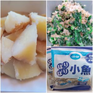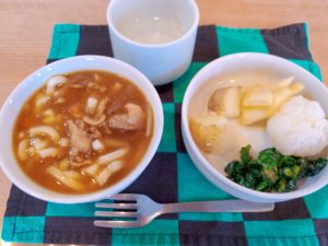 ☆カレーうどん☆コロコロおにぎり☆りんご☆新じゃが芋の蒸かし☆のらぼうのサラダ☆ポリポリ小魚