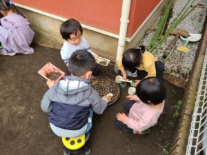今日は雨上がりのお庭で楽しみました♪少し湿った土を集めたりと晴れた日とは違う発見を楽しんでいた子ども達です😊お部屋の中ではお兄ちゃんお姉ちゃん達が卒園式の練習を楽しんでいる様子・・・雰囲気の良さがお庭まで伝わってきましたよ♪