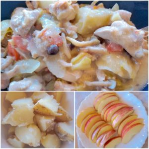 ☆春キャベツと鶏肉のクリーム煮☆新じゃが芋の蒸かし☆りんご