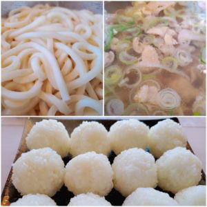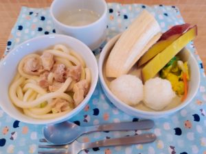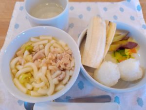 ☆鶏塩うどん☆コロコロおにぎり☆蒸かしさつま芋☆キャベツと胡瓜の浅漬☆バナナ