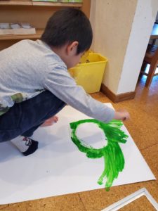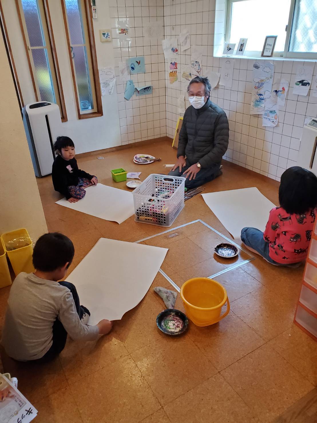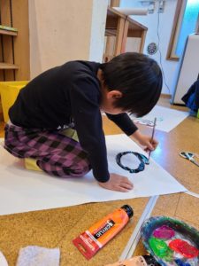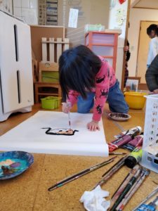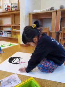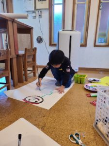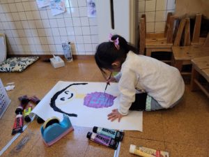 今日はアトリエの日でした😊自分の顔を大きな紙に思いっきり描きました♪いつもはお話し好きな女の子達も没頭していました…!!自分のイメージを広げています♪先生とのやりとりも楽しんでいました😊あれ…何か足りないなぁ~あっ‼鼻だ‼