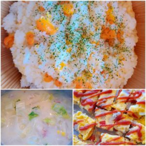 ☆人参ライス☆白菜とコーンのミルクスープ☆豚挽き肉とパプリカのオムレツ