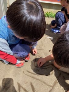 「ダンゴムシの迷路!」「ここがゴールね」とダンゴムシの迷路道を作ったり、