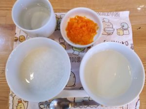 ☆軟飯☆白身魚のだし煮☆バナナ☆春キャベツと新人参の浅漬け(茹で)☆えのき豆腐の澄まし汁☆切り干し大根の煮物