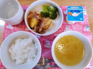 【後期】☆軟飯☆豚肉と野菜のトマト煮☆コーンのスープ☆茹でブロッコリー☆ベビーダノン