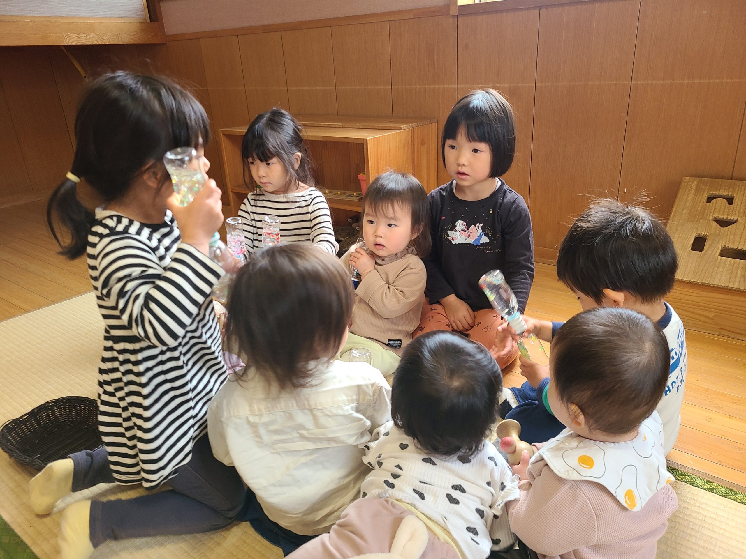 お部屋の中では小さい赤ちゃん達からお姉ちゃん達まで集まってキラキラウォーターに夢中でした♪異年齢で過ごしているどんぐりならではの光景です♪