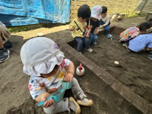 お庭では日陰の涼しい所で砂遊びをしたり、虫探しをしたりしていました。