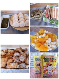 ☆鮭おにぎり☆のり☆コロッケ☆メンチカツ☆小魚☆魚肉ソーセージ☆フルーツミックス☆野菜ジュース