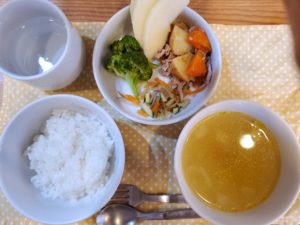☆豚肉と野菜のトマト煮☆軟飯☆彩りスープ☆ごぼうサラダ☆茹でブロッコリー☆りんご