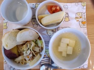 ☆焼うどん☆パン☆豆腐のスープ☆トマト☆さつま芋の甘煮☆バナナ