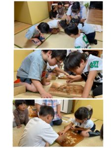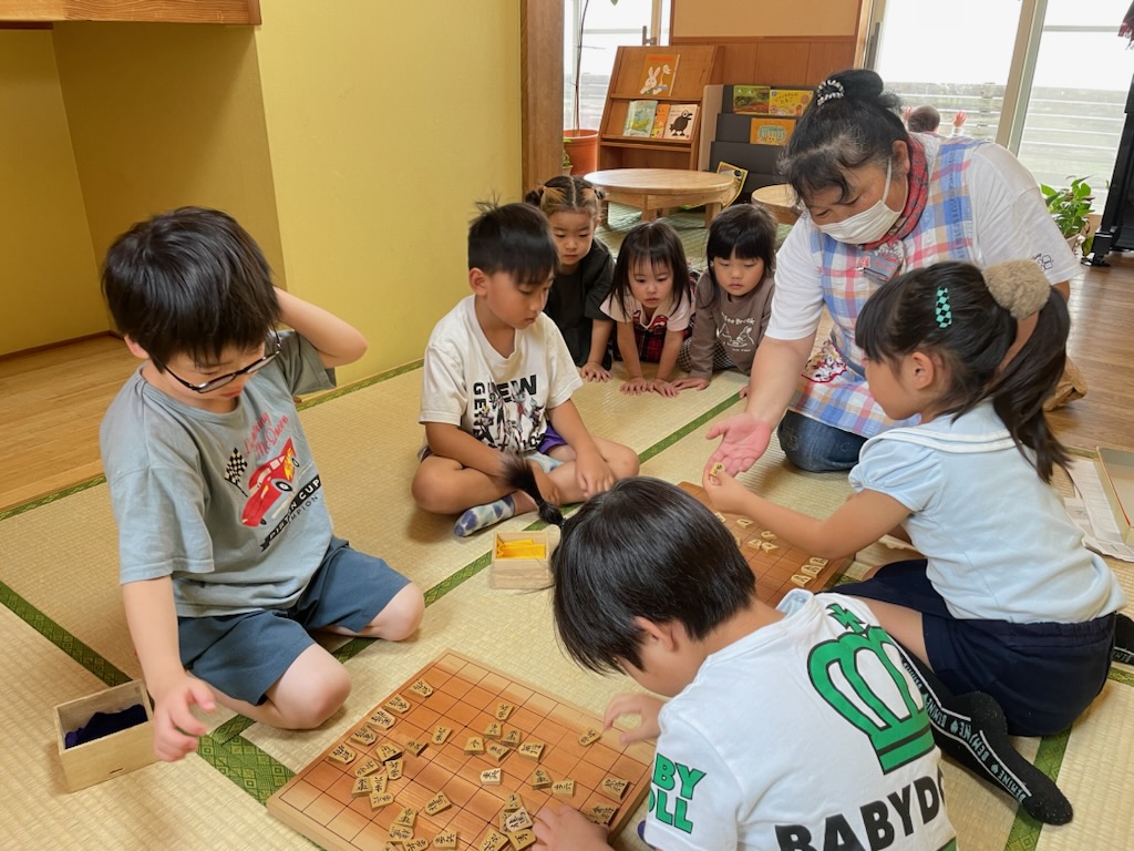 「宜しくお願いします!」と気合十分でした☺ 今日は駒の種類と並べ方をみんなでやってみました。昨年に引き続き将棋部に入部した年長さん達にリードしてもらいながら集中して取り組んでいた子ども達です。