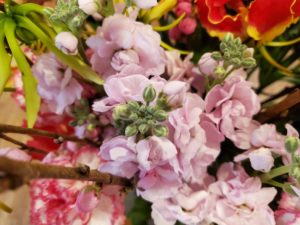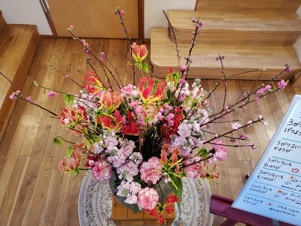 毎週火曜日お花屋さんからどんぐりの玄関にお花が届きます。3月3日の『ひな祭り』『桃の節句』にお似合いのお花達でした。桃カーネーションストックグロリオサリリー