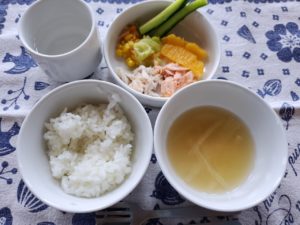 【完了期】☆軟飯☆大根の味噌汁☆鮭の姿焼き☆イサキの塩焼き☆きゅうりスティック☆彩り野菜炒め☆オレンジ