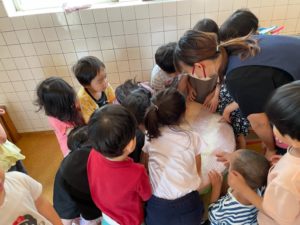 子ども達の大好きなアトリエ室を更に楽しい場所にするために、今日は子ども達と相談しながら準備を始めました。そこへ