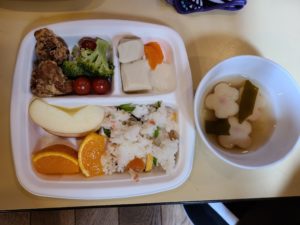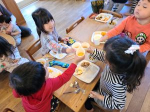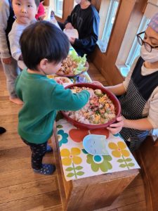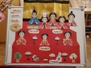 今日はひな祭り会を開きました。ひな祭りにちなんだクイズ大会をして、楽しみながら行事の意味を知ったり、ひな人形塗り絵や紙芝居などを楽しみました。ランチはちらし寿司や花麩の入った澄まし汁などが用意され、彩り豊かなひな祭りランチを味わいました。まだまだ厳しい現状が続く中ですが、子ども達が健やかに成長してくれることを願います。